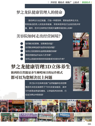 梦之队3D立体养生推广自然能量养生项目整整四年多的发展拥有了7000多家加盟店,其中50%都是由美容院嫁接,让美容院利润倍增,已经成为美业中的佳话!